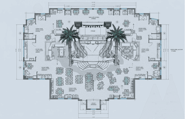 Mango’s Tropical Cafe Orlando is a two-story, 55,000-square-foot entertainment complex that combines a restaurant, nightclub, live performance venue, and event space under one roof. The venue is built around a massive central stage, multiple lounges, and X kitchens/hoods that support a full-service restaurant, banquet operations, and high-volume beverage service. Behind the scenes, more than 14,000 square feet are dedicated to kitchens, bars, and back-of-house support, including a primary production kitchen, prep and banquet kitchens, and a warming kitchen on the second level.